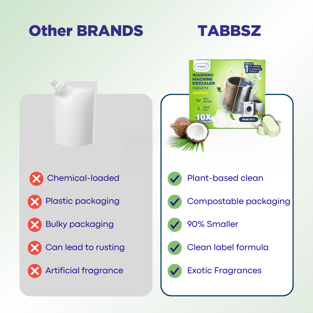 TABBSZ Washing Machine Descaler Tabs are single-use, single-dose cleaners that deep clean your machine from the inside out. One tablet per cycle removes limescale, detergent residues, and foul odors, keeping your machine running like new.