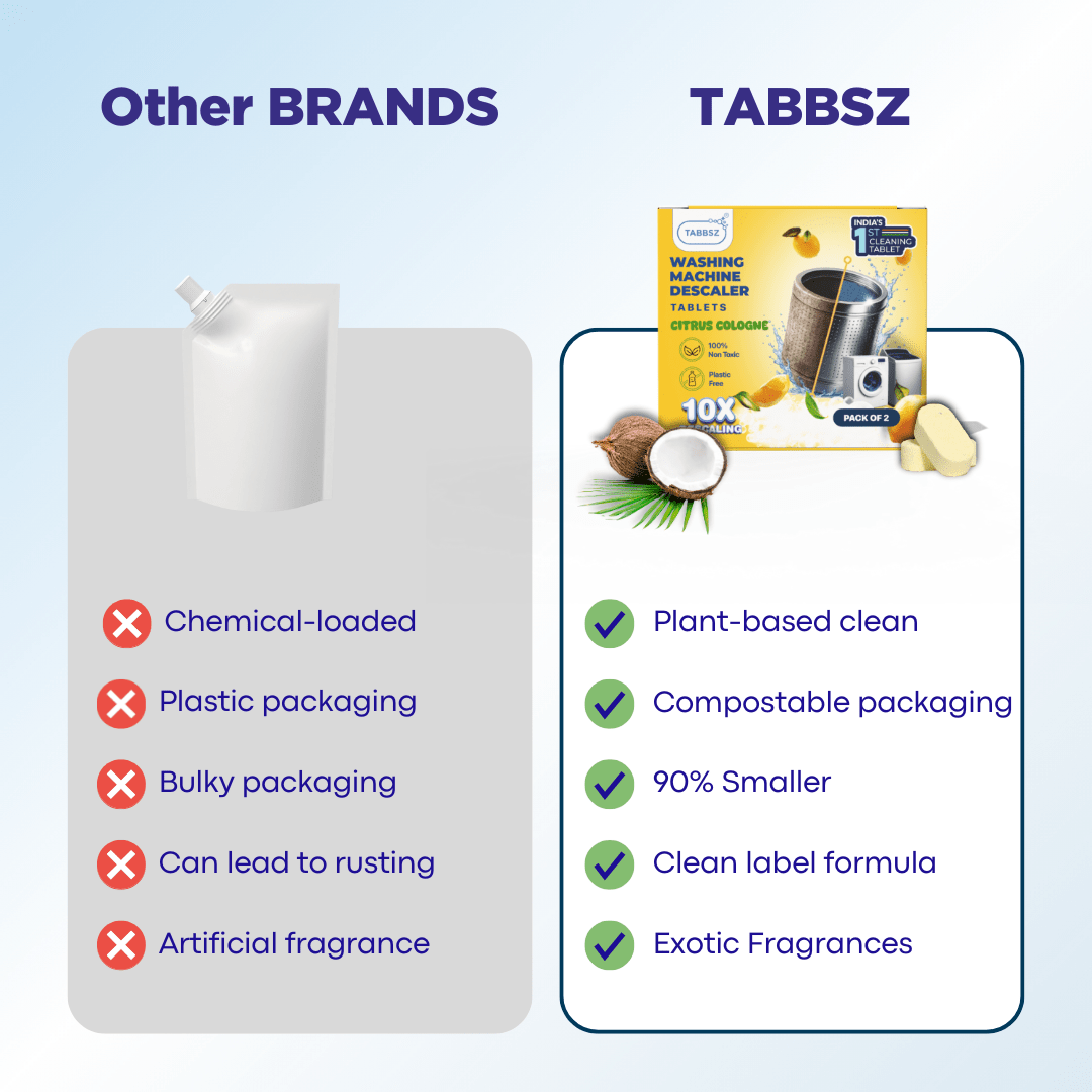 TABBSZ Washing Machine Descaler Tabs are single-use, single-dose cleaners that deep clean your machine from the inside out. One tablet per cycle removes limescale, detergent residues, and foul odors, keeping your machine running like new.